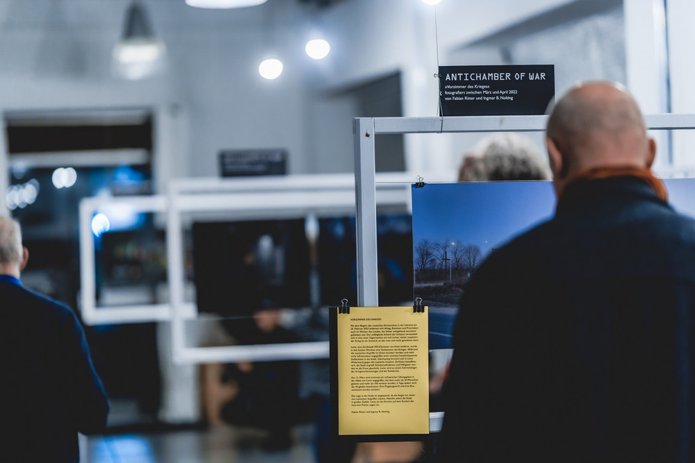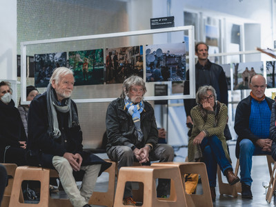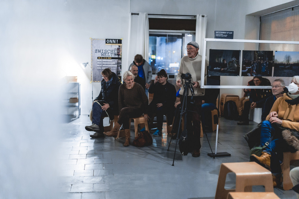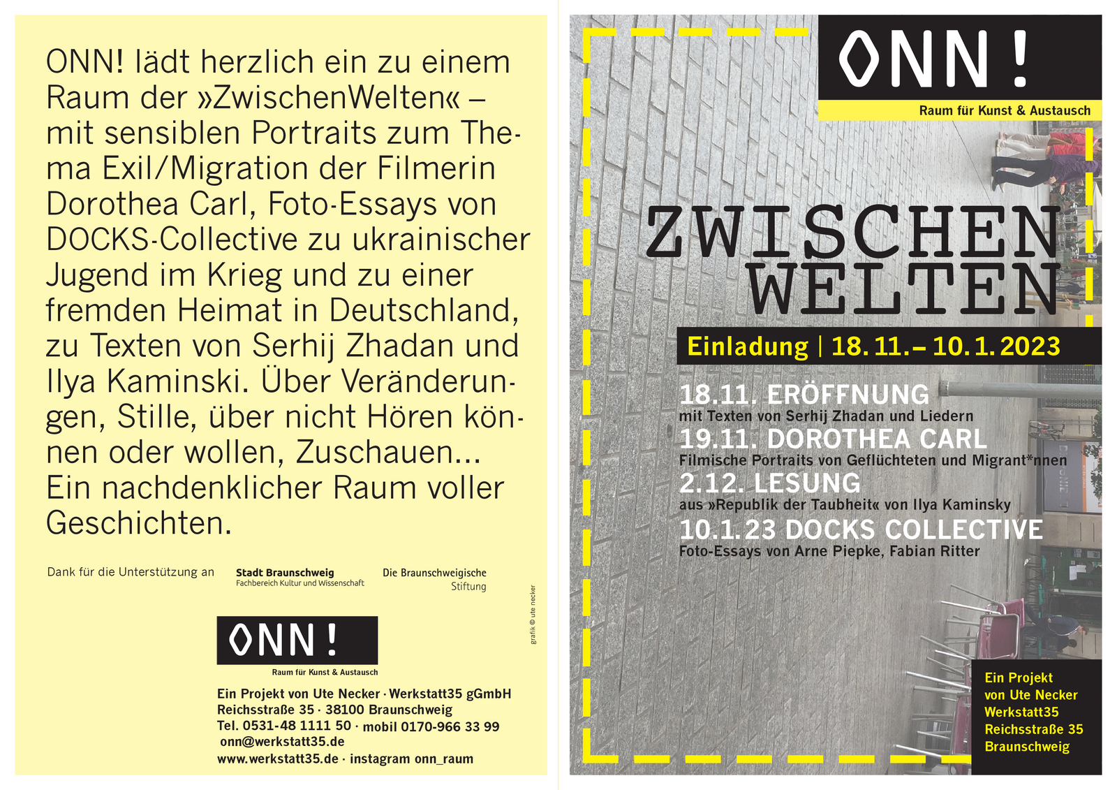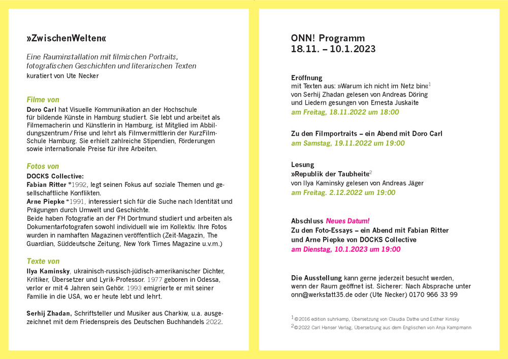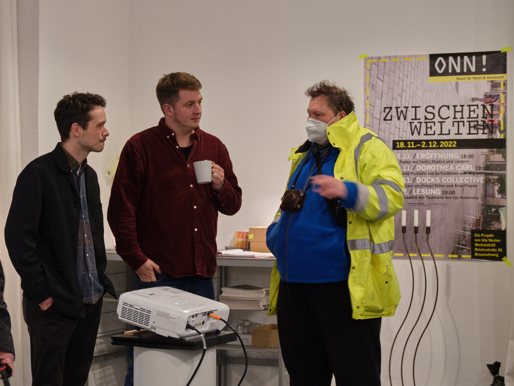 mit filmischen Interviews von Doro Carl zu Migration und Flucht, Foto-Essays von DOCKs-Collective (Fabian Ritter und Arne Piepke) und Lesungen mit Texten von Serhij Zhadan (gelesen von Andreas Döring) und Ilya Kaminsky (gelesen von Andreas Jäger)
