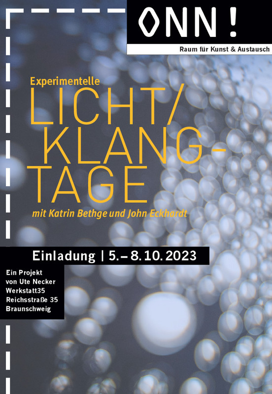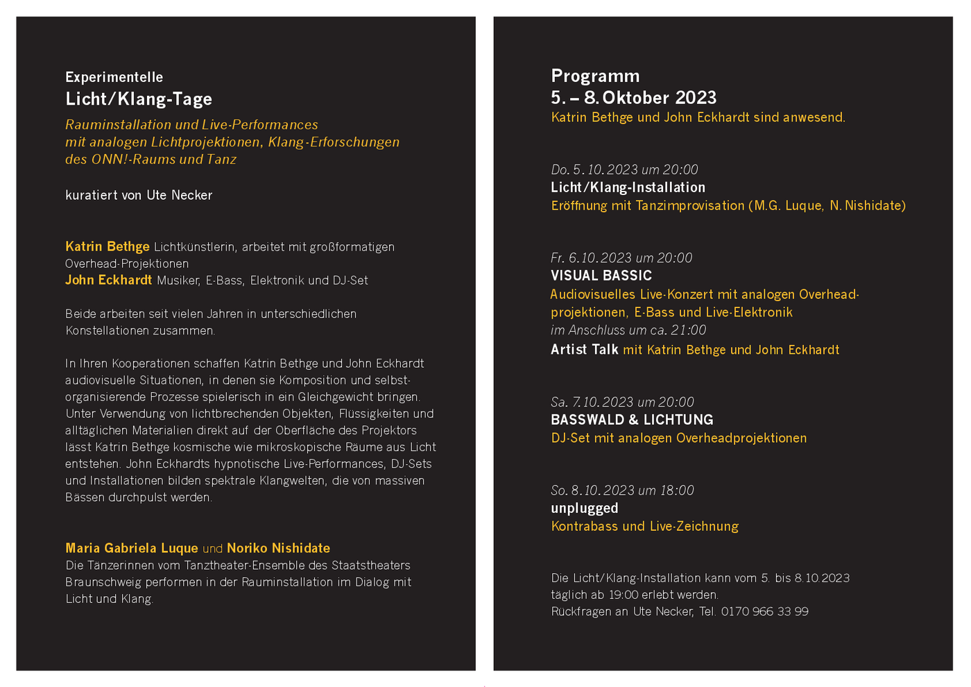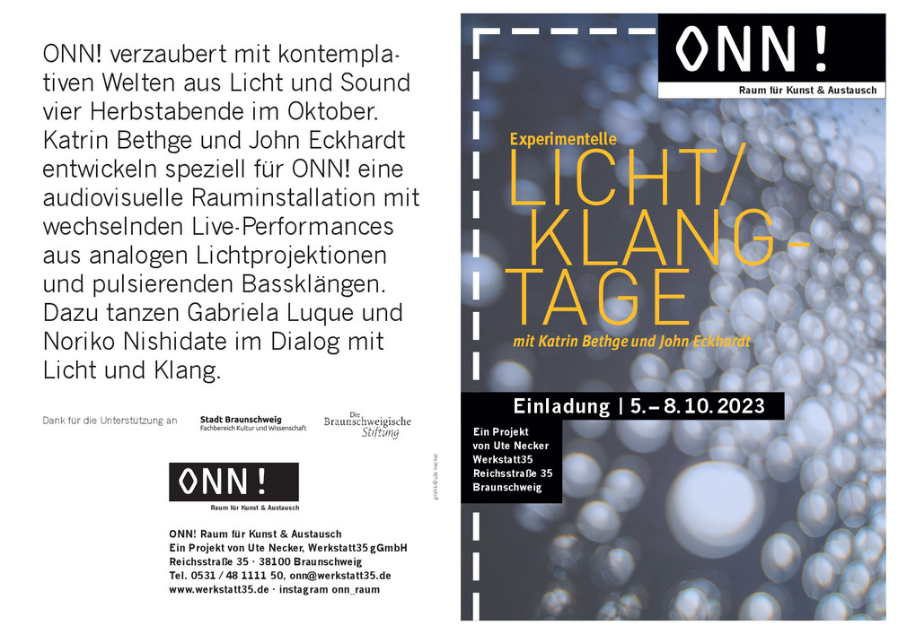 Katrin Bethge und John Eckhardt entwickelten speziell für ONN! eine audiovisuelle Rauminstallation mit wechselnden Live- Performances aus analogen Lichtprojektionen und pulsierenden Bassklängen.